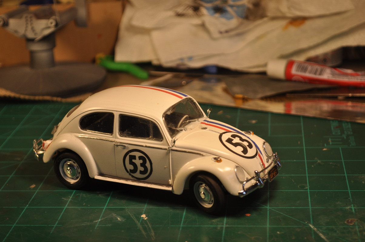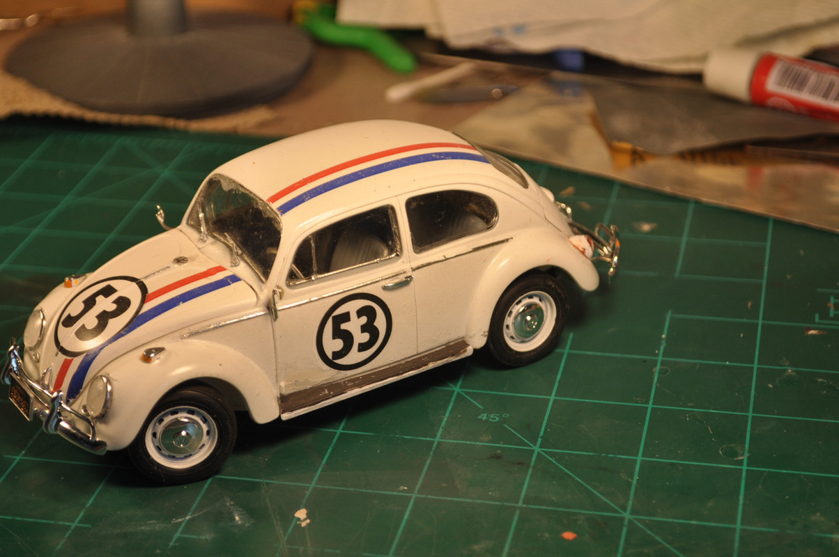 Calling it done. It needs to come off the bench. Still a bit of touch up on tail lights to do. My old bug-a-boo of clear parts came in to haunt me, though. I thought I had dipped the small pieces on the sprue in Future....oops. Hence, we don't have headlights, we have "fog" lights. Oh well...lesson learned. Still not sure why the BMF acted the way it did. Perhaps, as was suggested, it is just too old. I wonder if room temp had something to do with it as well.