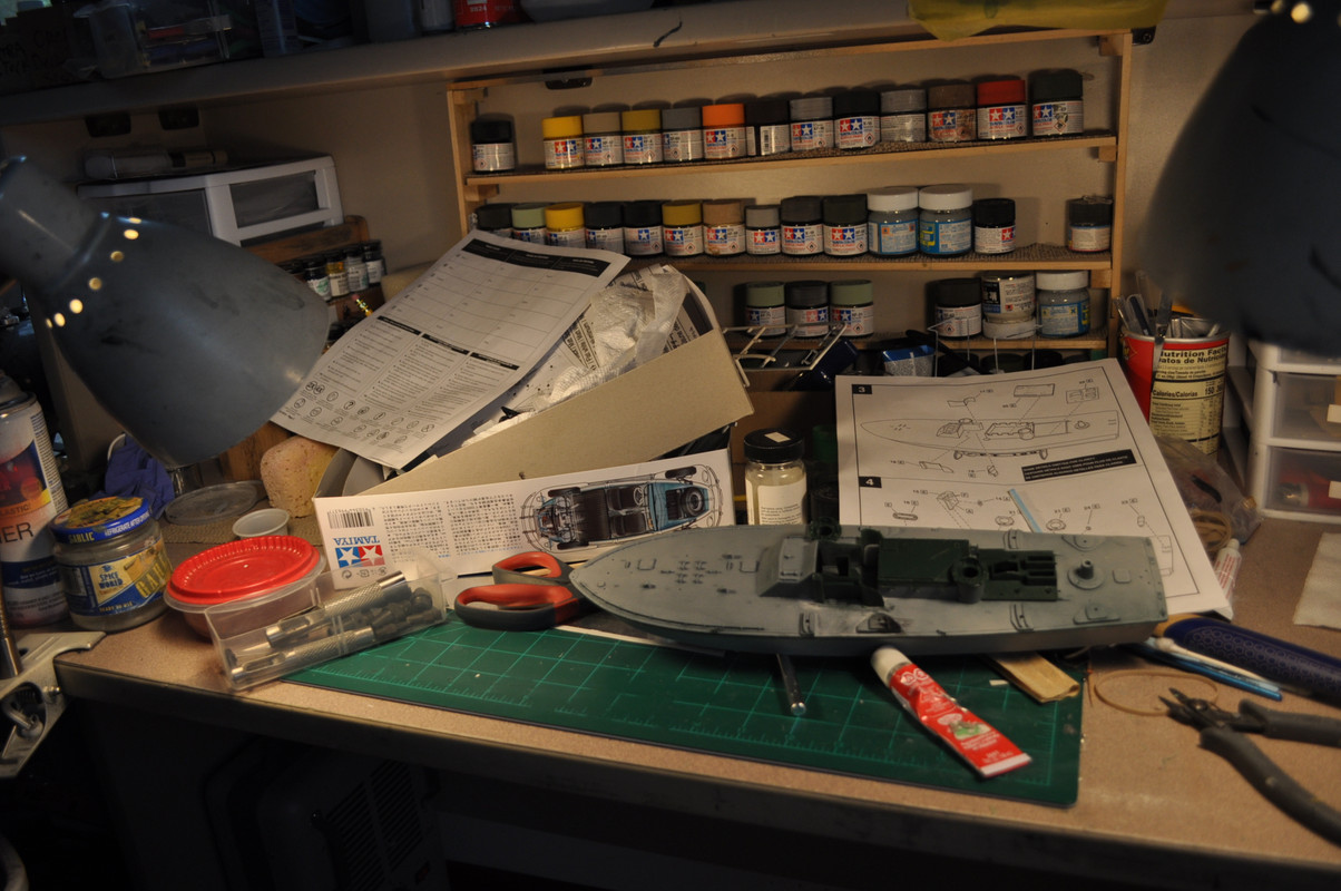 I spy a PT boat! Thank you so much for posting your bench shot, Lyle—makes the scale of the model easier to understand, which is important. Are you doing a mix of brush painting and air brush? I’m curious about your approach. I better go check your thread. The Porsche was a test. I plan to add gloss white to approximate the fiberglass shell color then follow that with some kind of Ron Burgundy mix on top of that. Or add another layer of silver and shut off my brain. I think many of my problems are caused by overdoing the steps. I could just go straight to Ron Burgundy then decal the stripes too.