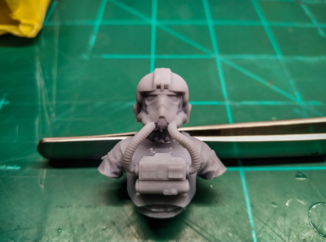 My latest update from Floki concerns the pilot figure. Having found a close approximation on eBay, I was bowled over to see this incredible improvement designed by Clint. He took a TIE fighter head and torso and shrank it to 1/24. Brilliant.