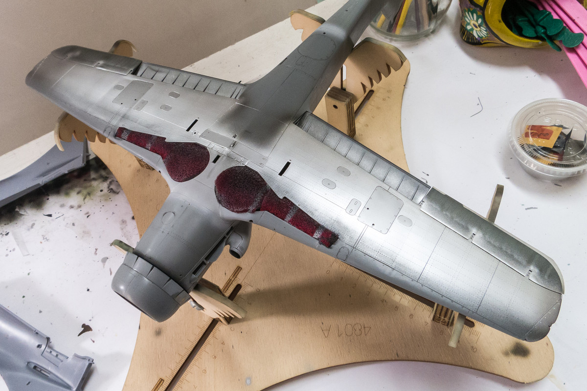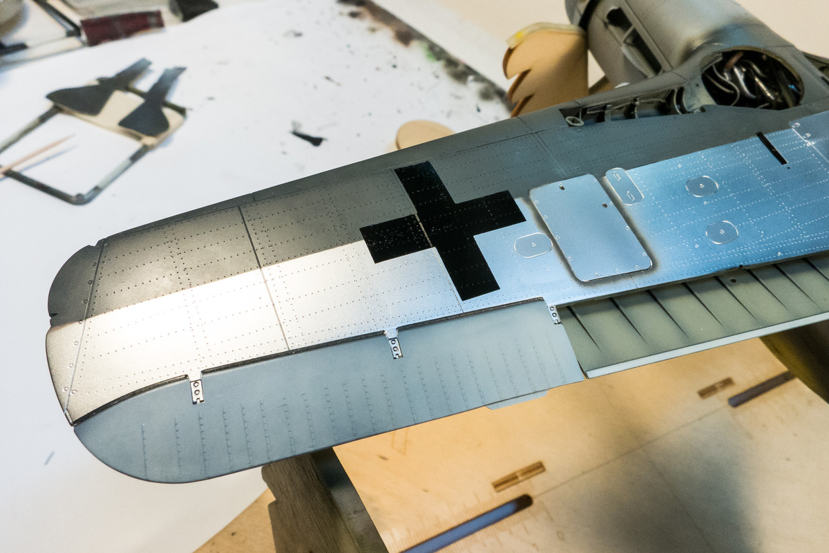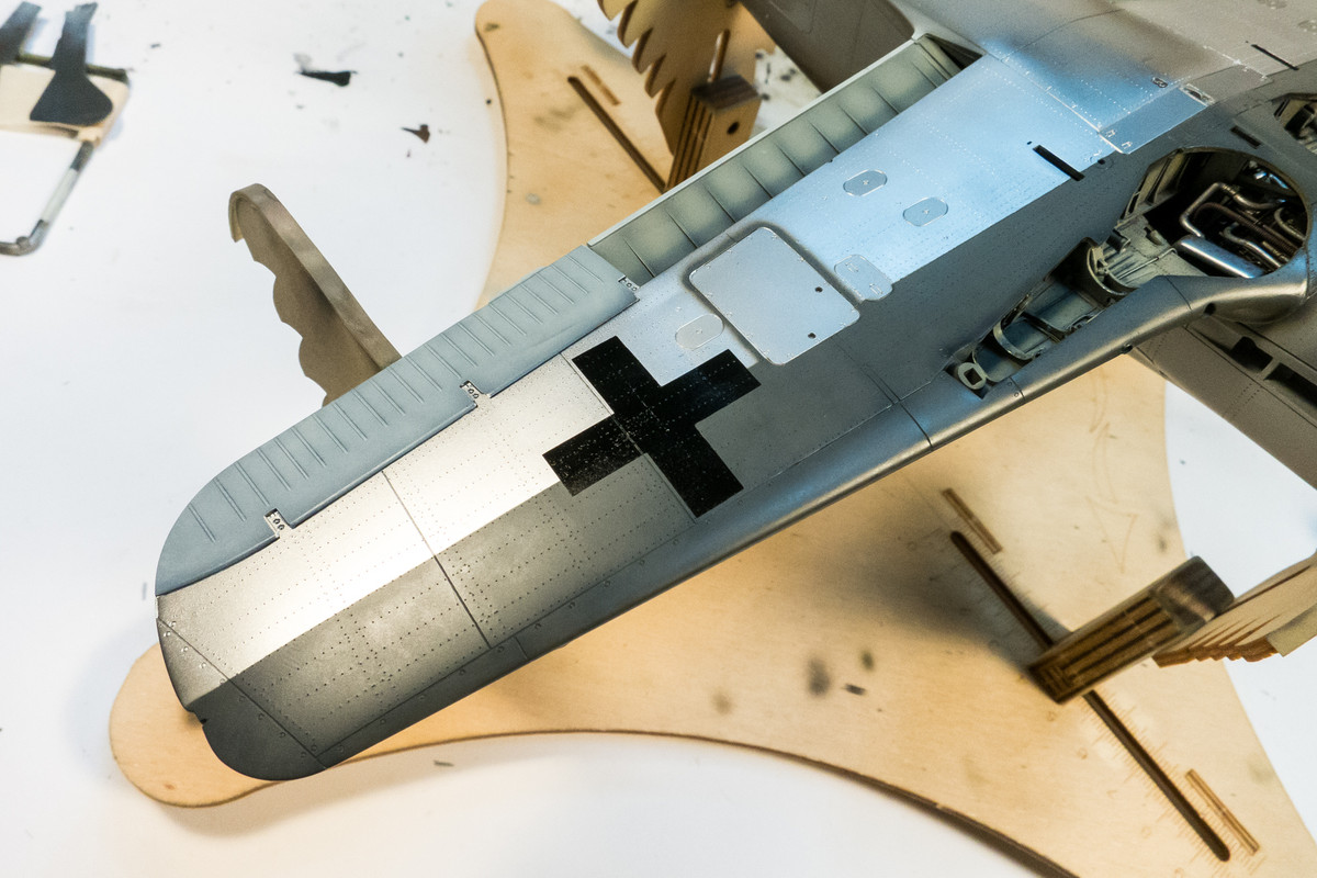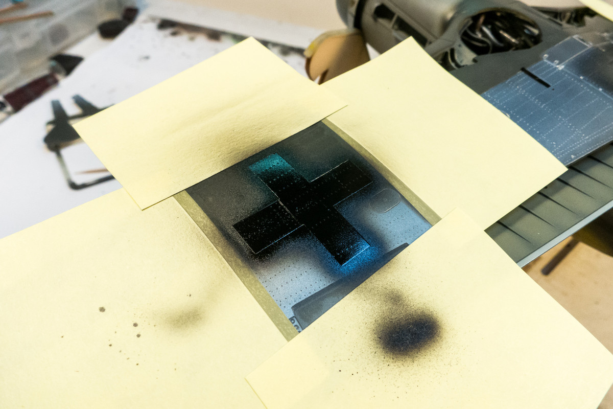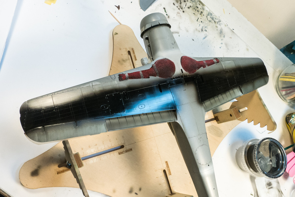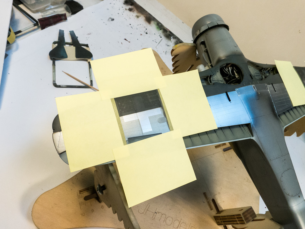 I understand that the above profile is purely speculative since the only photo of 836016 is black and white and only shows the aircraft from the double chevron marking back. My placement of the 81/82 will be different as I want the lighter 82 around the canopy/windscreen/cowling as I agree with Crandall's assertion that the mottle pattern on the area in front of the windscreen is dark on light rather than light on dark as proposed by JaPo. After the base camo is established, a random mottle pattern using 82/83 will be placed over all of the upper surfaces.