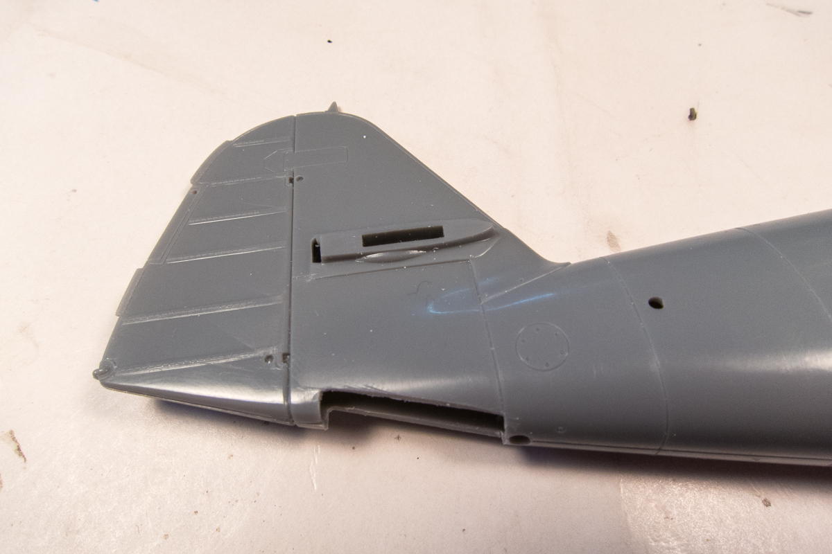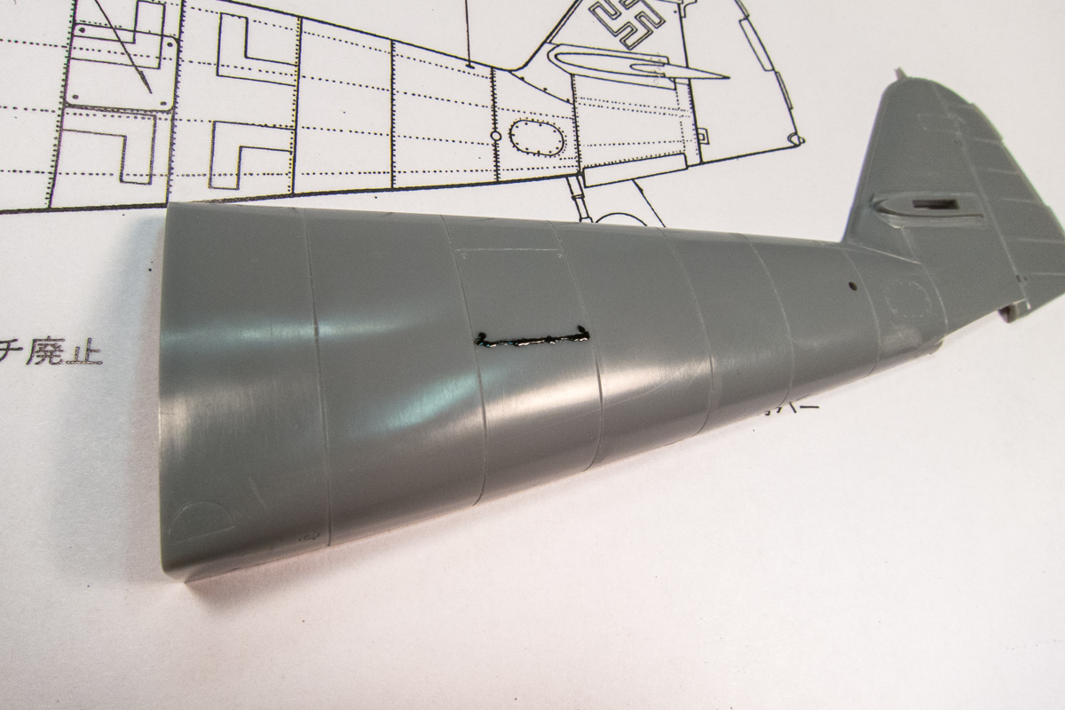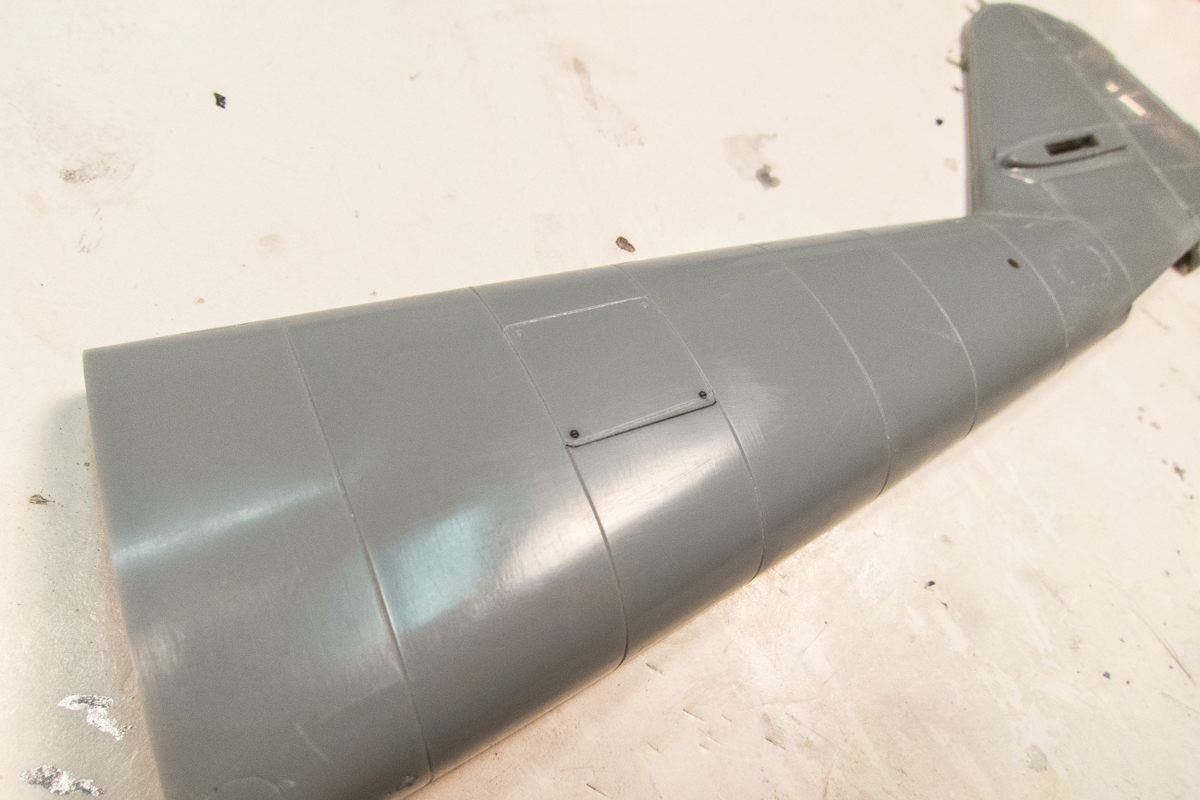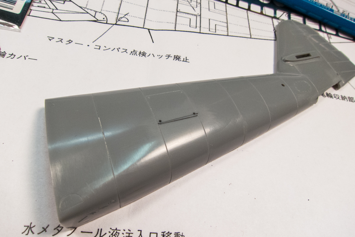Using a couple of online articles, I am in the process of making some corrections to the Hasegawa kit. The small bumps at the base of the horizontal stabilizers are not present on the K-4 and need to be removed. The gouges and saw marks from the tail door removal will be repaired, don't worry!
