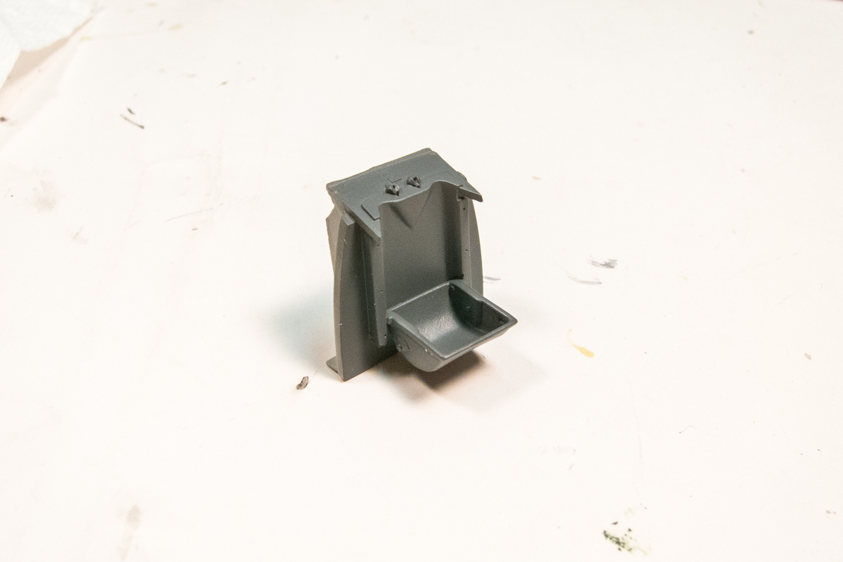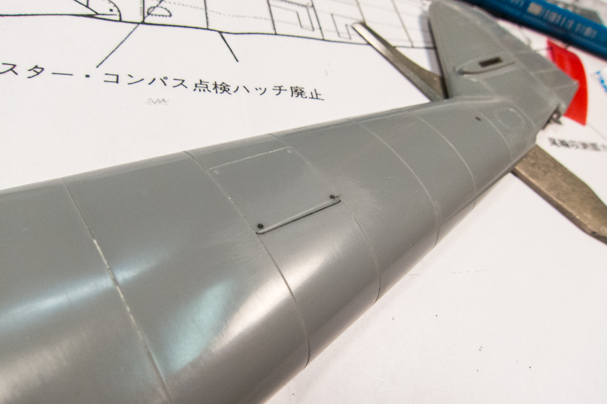 It's difficult to gauge the results so I spray a light coat of Mr Surfacer 1200 to check the new line. After this dries, I will put new circular bolts in the corners.