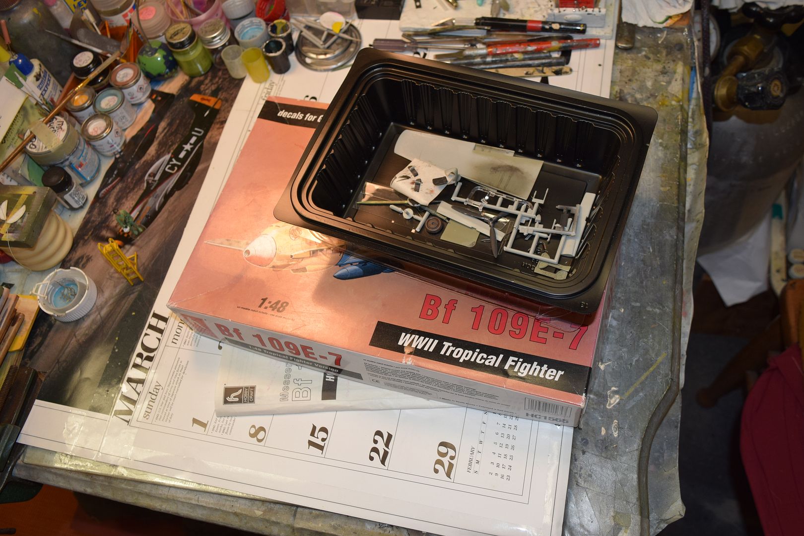 This is my upcoming project. It's the Hobbycraft Bf-109E-7 Tropical in 1/48, of course. I started working on the sub-assemblies several months ago, concurrent with the F-102, and then sit it aside to concentrate on the big delta model. It should be just about ready for assembly and paint work.