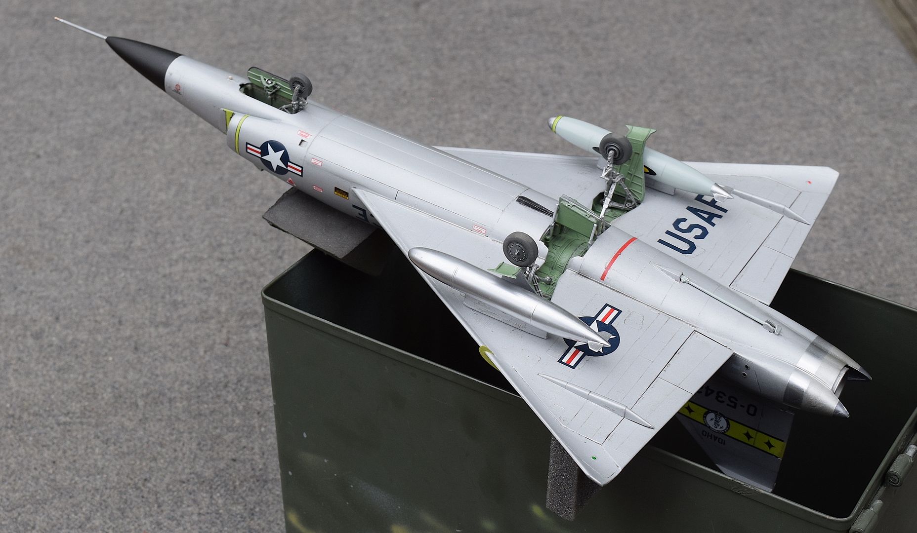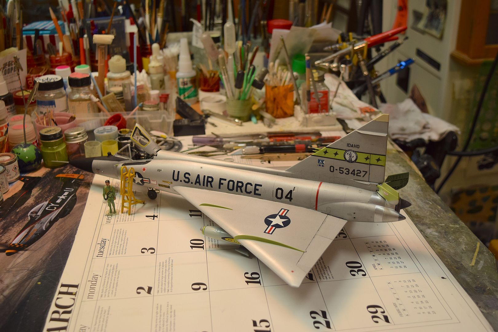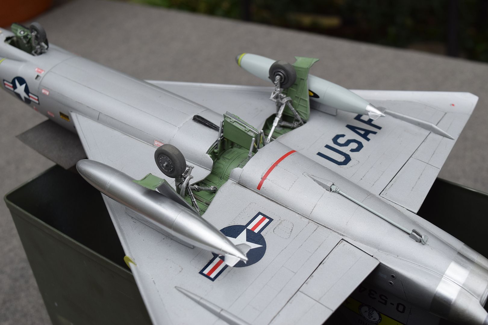 And here is what's been occupying the workbench for the past six months. I finally finished the Monogram Convair F-102A Delta Dagger, after beginning the build around the first of May. I took some underside pics earlier this week, before adding the final topside parts. And then I took a few "sneak preview" photos of her sitting on the work table. Hopefully, I can get the model out to the airport in a few days for a proper photo session out there. But for now, here are a few inside finished pics and some of the bottom side too.