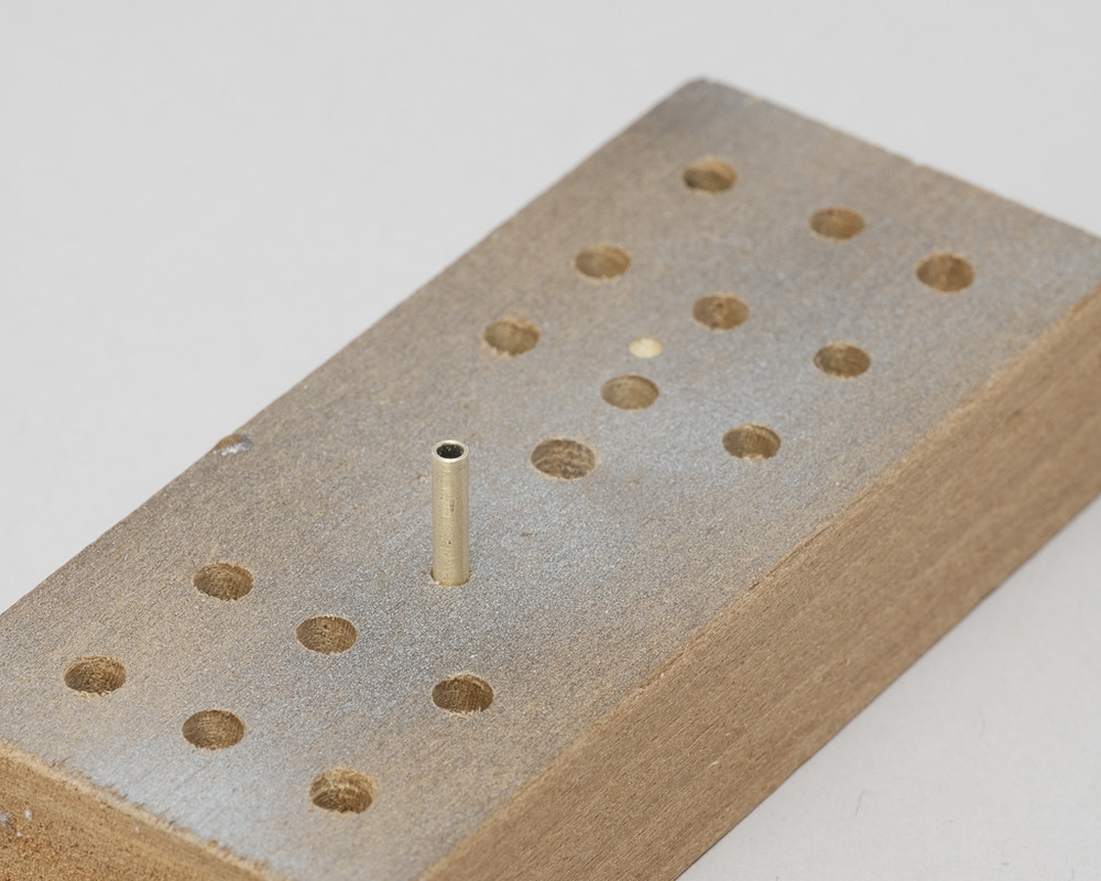 I will add attachment pins to the prop blades with 1/16 rod, so I drilled holes in the spinner to receive them.
