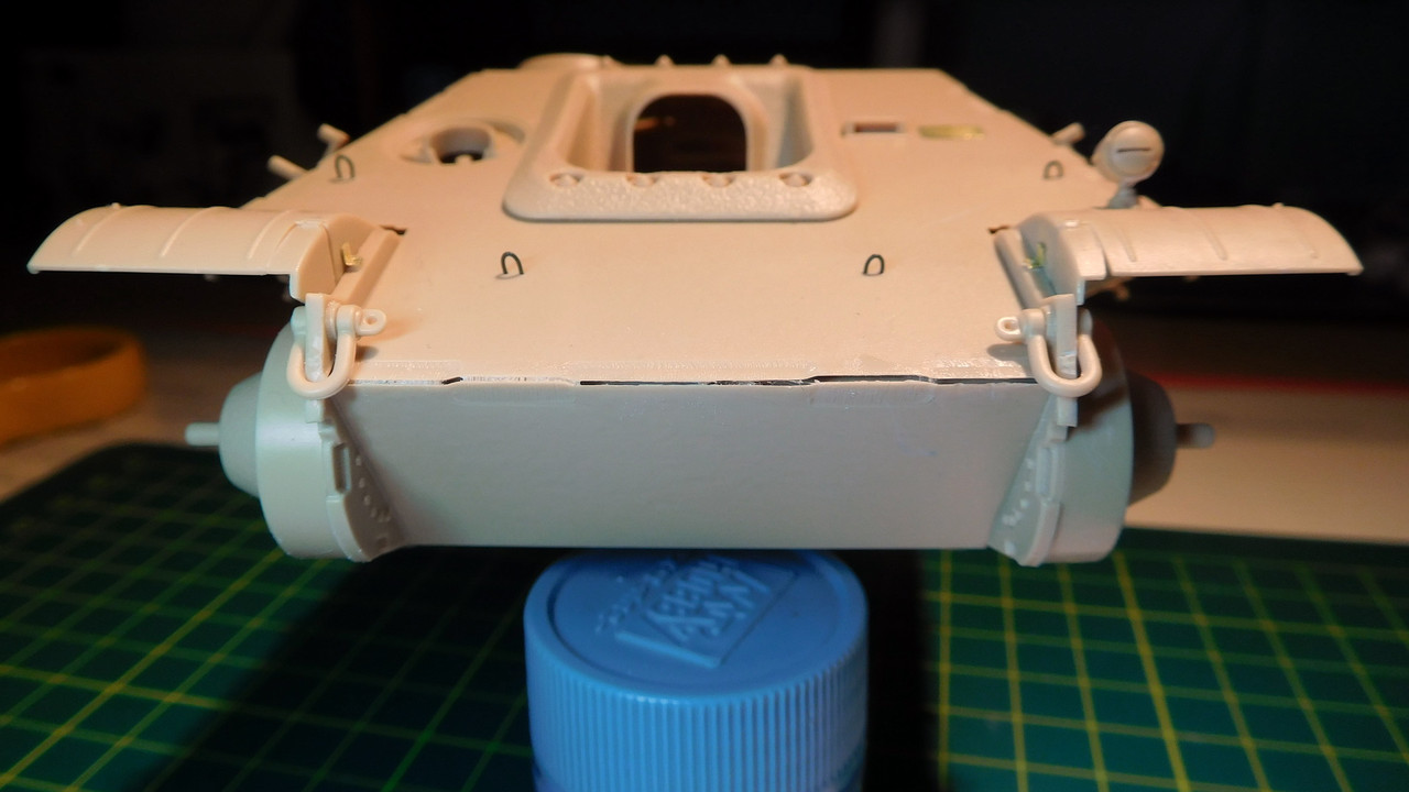 I "found" a pretty ugly gap in my Jagdpanther, so instead of using stretched sprue to fill the gap, I decided to go for liquid styrene or "Sprue goo" as it is better known..