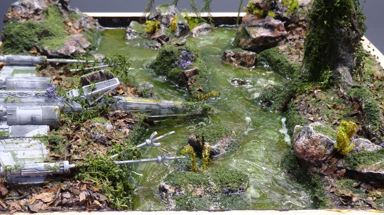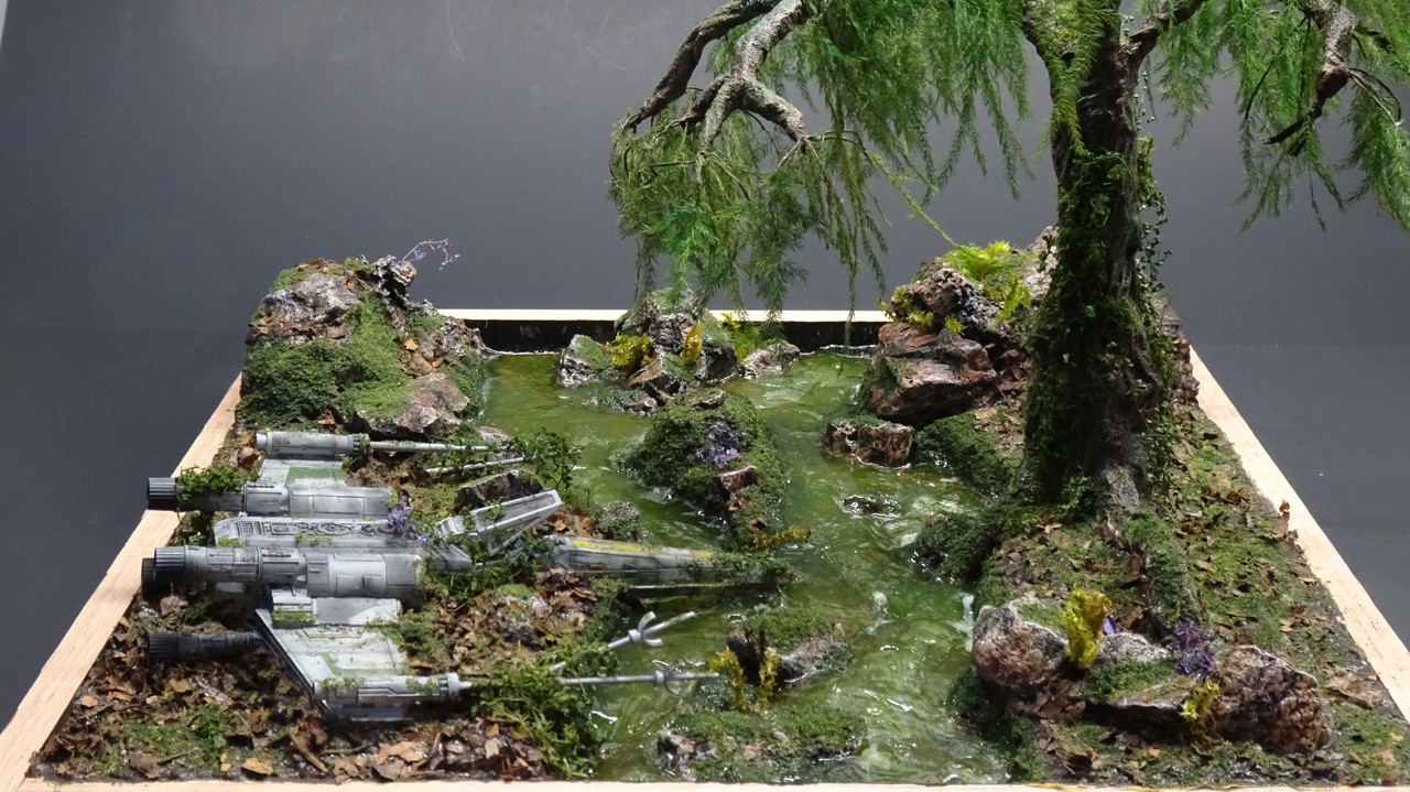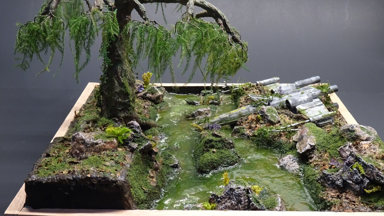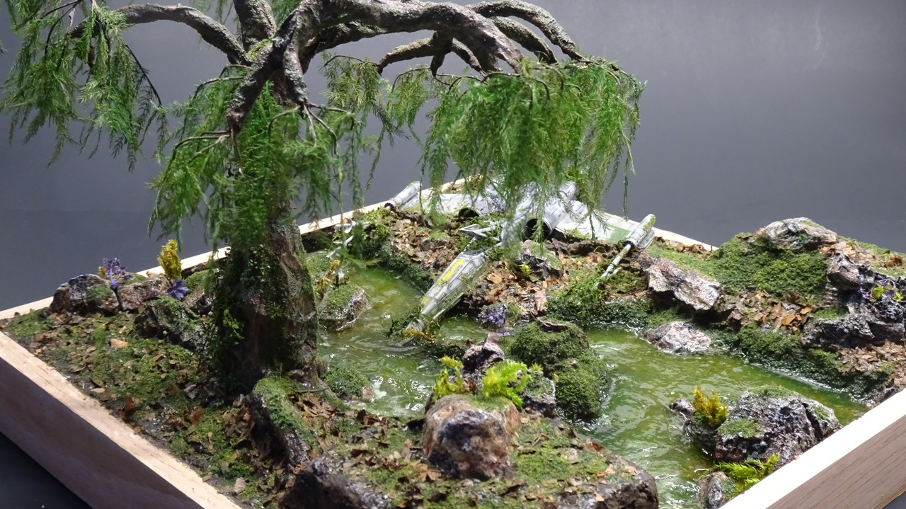 Shades of Dagobah there :wink: That is one very fine looking scene that you built. Everything looks just right all the way around, the ship, the plants, and the water & ground work.