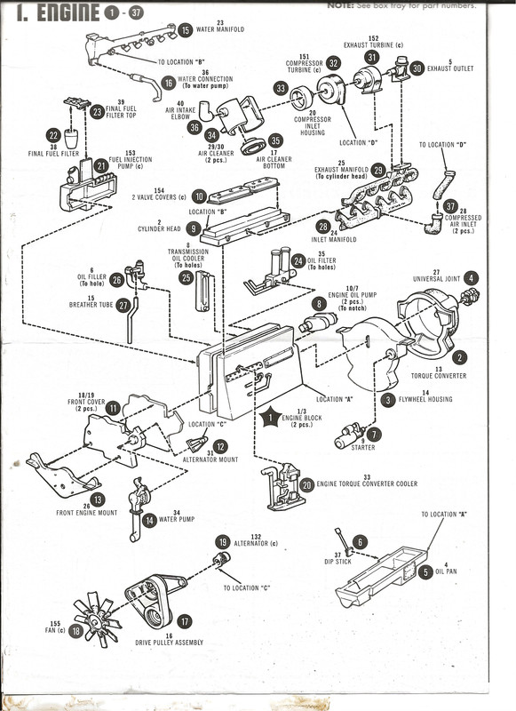 It has a large engine. That is the first assembly that is listed. Steps 1 to 37 and there are 42 parts. Here it is. Went together surprisingly well. Another nice touch is that none of the parts have the part number on the sprue tree. None. They printed a parts "map", though. It was kind of them to put it on the BOTTOM OF THE BOX