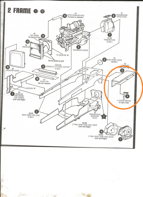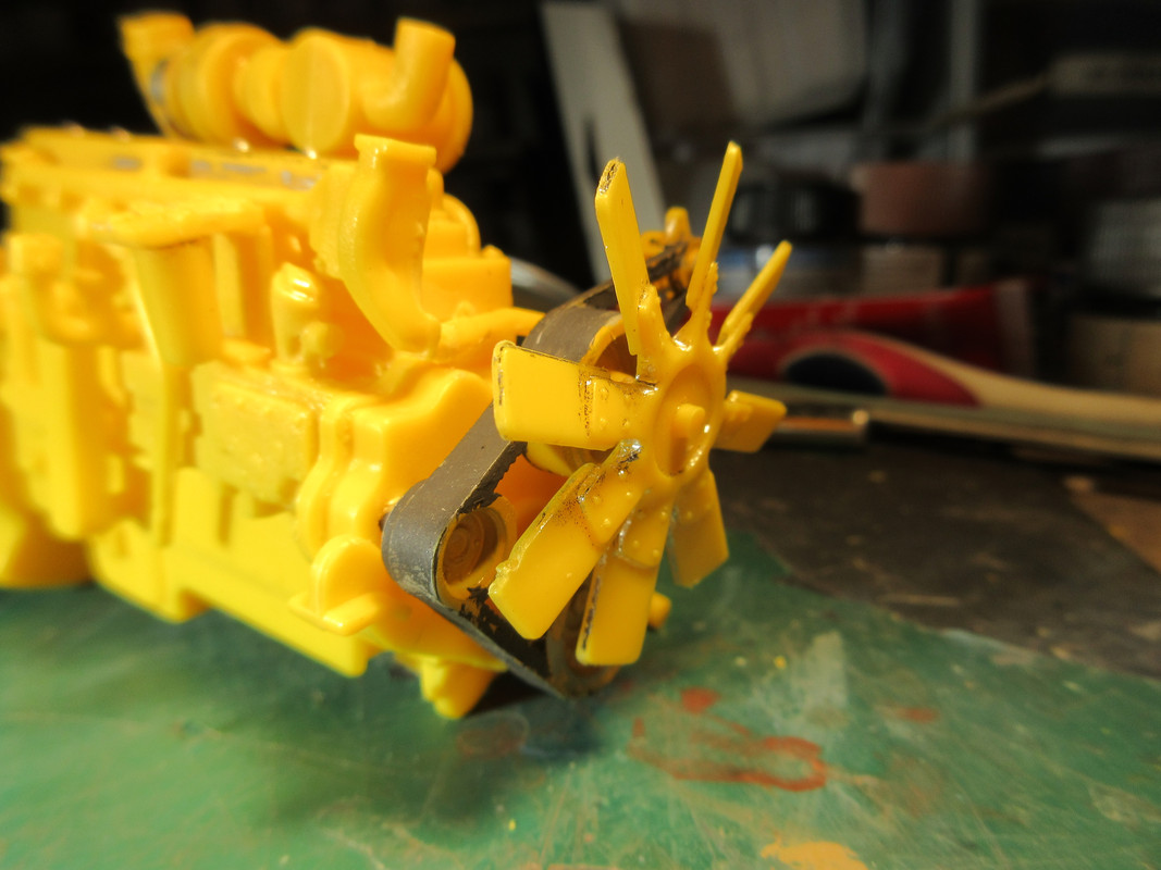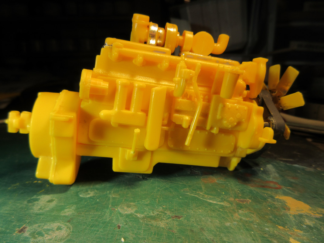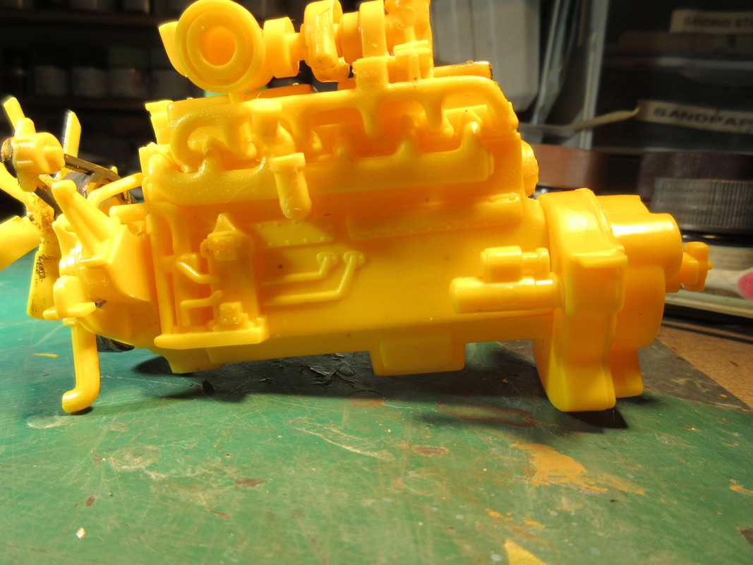 A lot of parts and for some unknown reason, a large chromed sprue with the main drive wheels, cab floor, bits to the engine, etc. Have you ever seen a dozer with chrome valve covers and a chrome fan? I don't know who chromed their stuff, but it was tough. Well, half of it anyway. soaked it in straight bleach for a while. one side was completely removed. The other side barely touched. Rinsed that away, soacked it in 99% Isopropyl Alcohol, a bit more came off. Soacked it in the Stripwell paint/finish remover and I was able to get enough off usisng a couple of stiff brushes. Sheeesh.