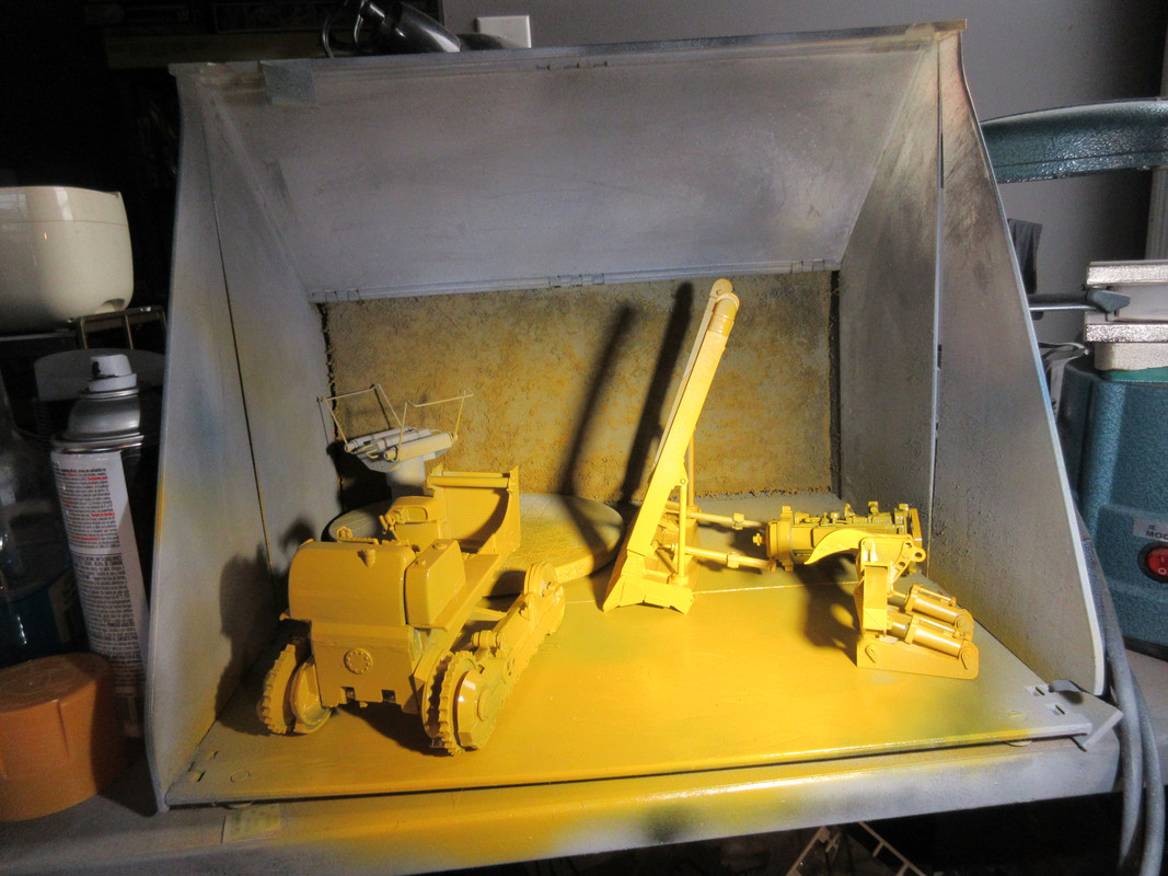 Second coat of Rust-O-leum Farm & Implement Caterpillar Yellow is on. I do not like this stuff simply because it is enamel and takes 24 hours to dry to handle and probably longer to completely cure out. Covers pretty well, though. Used to the Tamiya "instant drying" stuff.