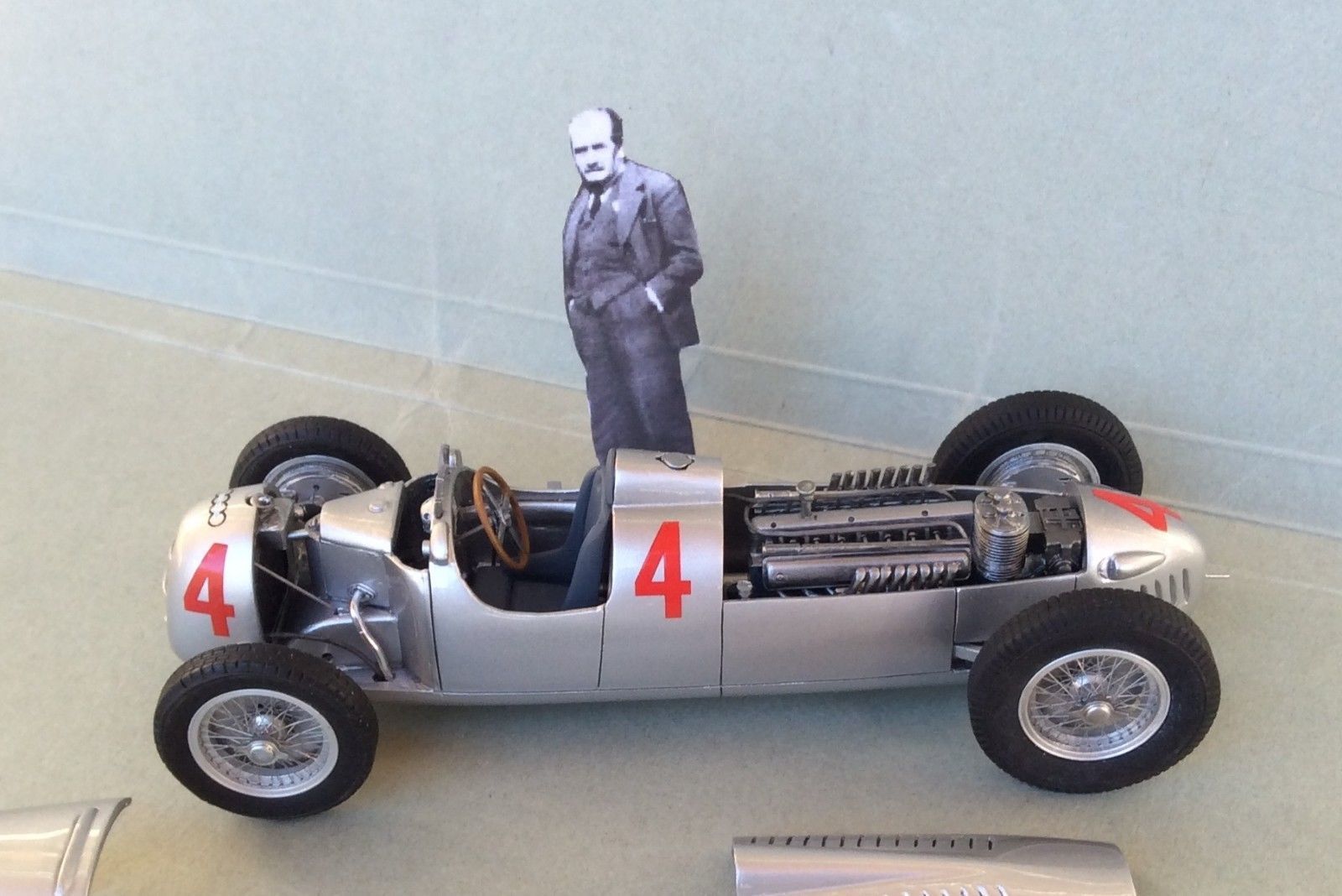 Since I'm a huge fan of those Auto Union racers, I chose that one for my first try. Pinto's instructions consist of a exploded parts drawing and one receives all the parts but none are labeled. The Ferrari kit has so many little odds and ends that allegedly go together to form that beautiful model. The Auto Union seemed much simpler. And it kicked my *ss! Getting the resin parts free from the surrounding flash was incredible frustrating. The exhausts were simply put, a nightmare: