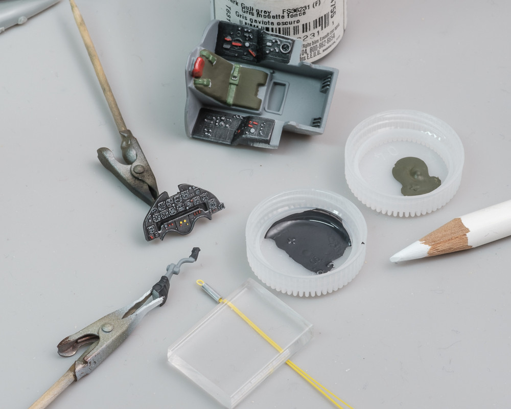 I found a kit in my stash molded in yellow styrene and used some stretched sprue from that to create a pull ring for the ejection seat.