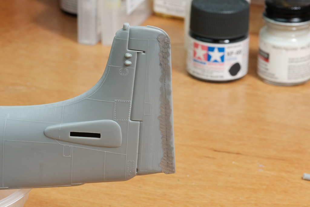 The vert stab needed some work. The nav light on top was split in two , one half on each fuselage half, and of course, the two halves did not lign up, so lots of work with a file and sanding sticks made it look respectable I think.. I removed the actual light and just left the post so I will add the light later... The trim tab was molded as one piece as part of the right fuse half, resulting in a huge 'panel line' that needed to be filled and rescribed.