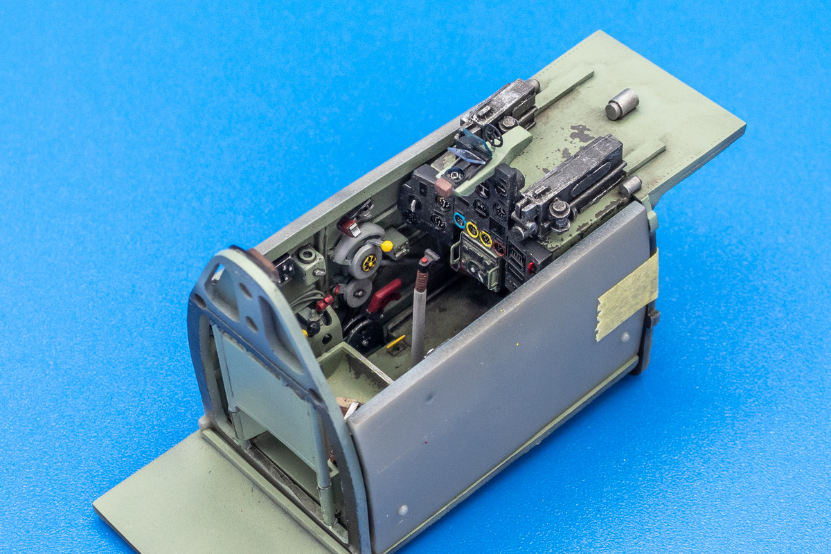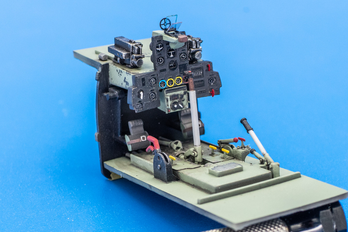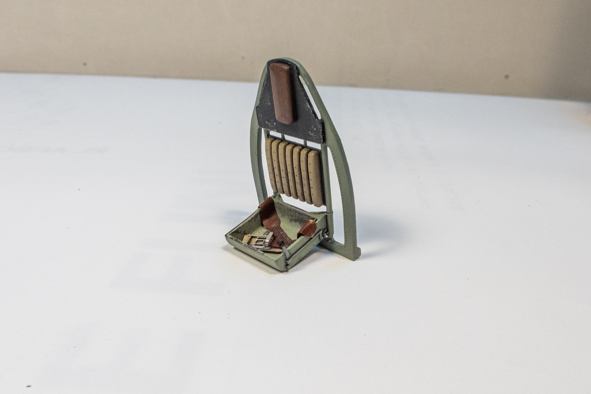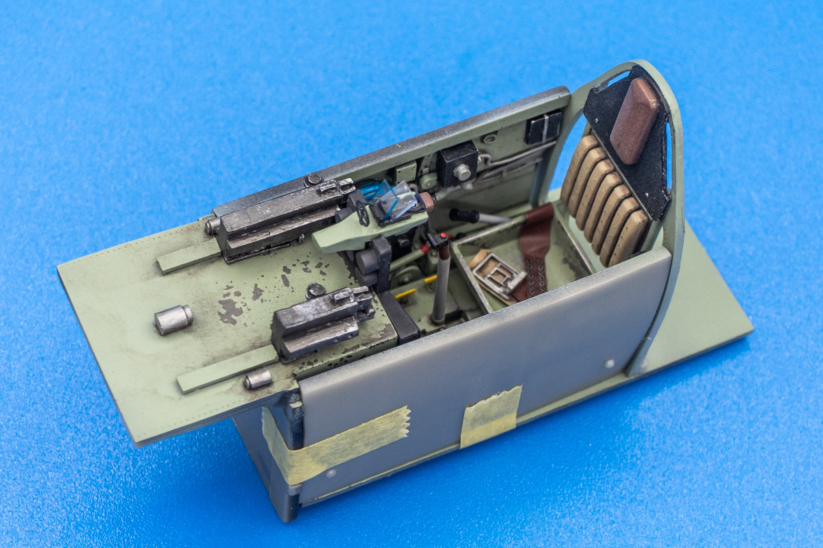 The cockpit floor and seat got a slightly different treatment and a metal color was laid down prior the Grey-Green to incorporate some hairspray chipping.