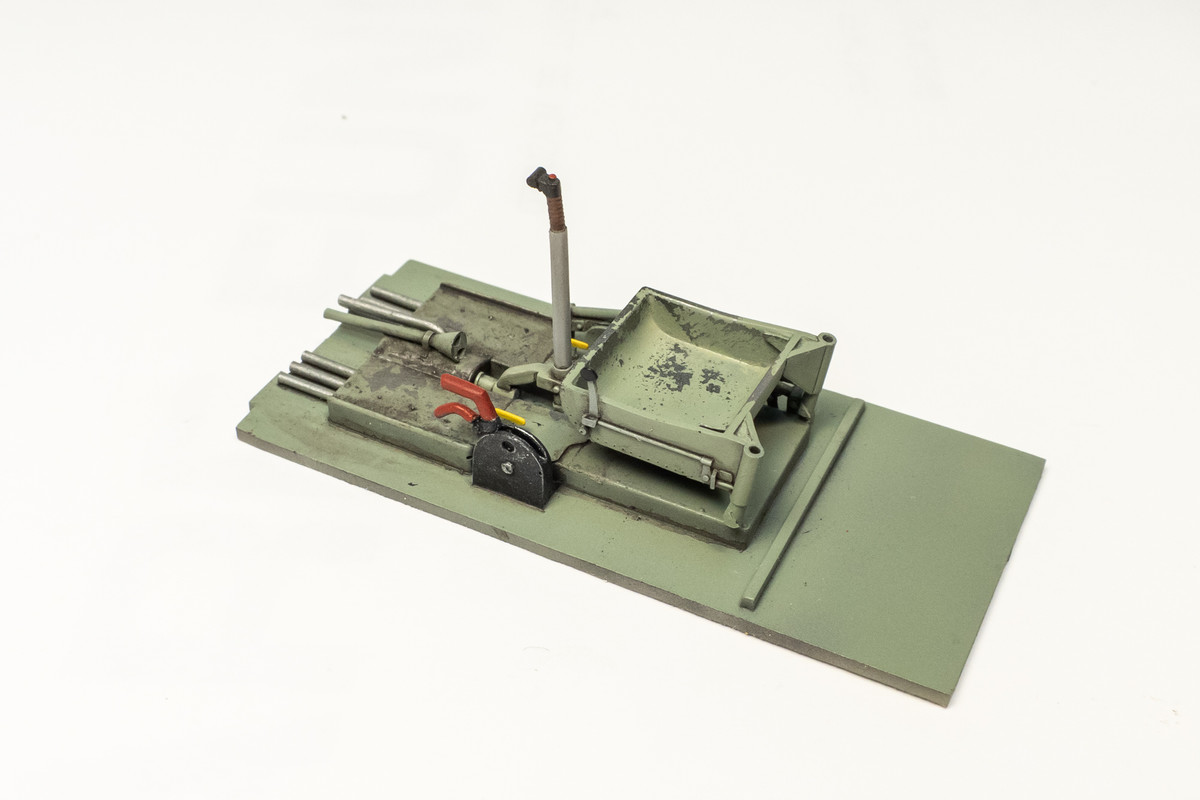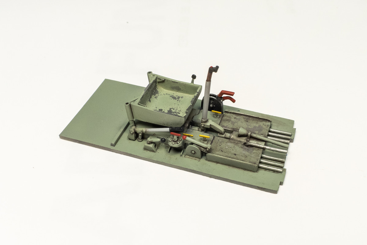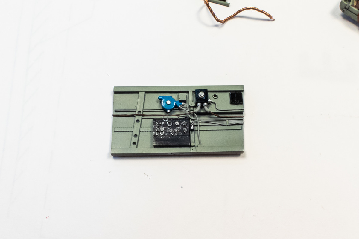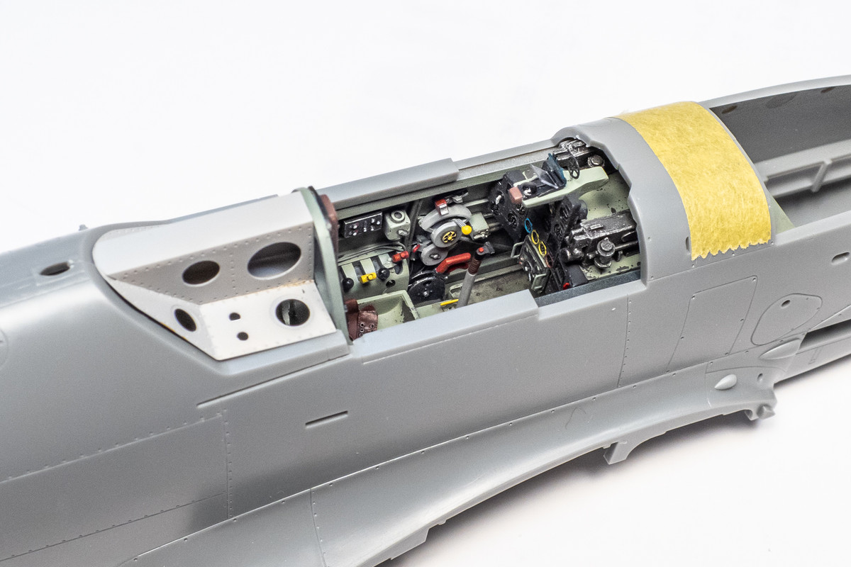 The cockpit floor and seat got a slightly different treatment and a metal color was laid down prior the Grey-Green to incorporate some hairspray chipping.