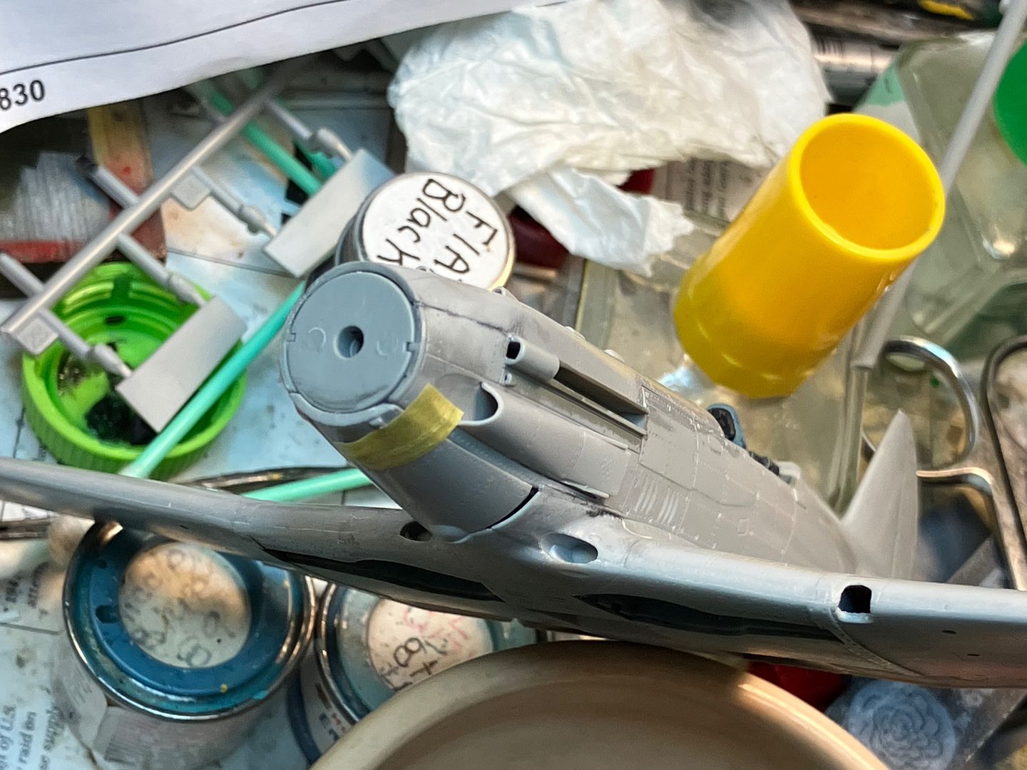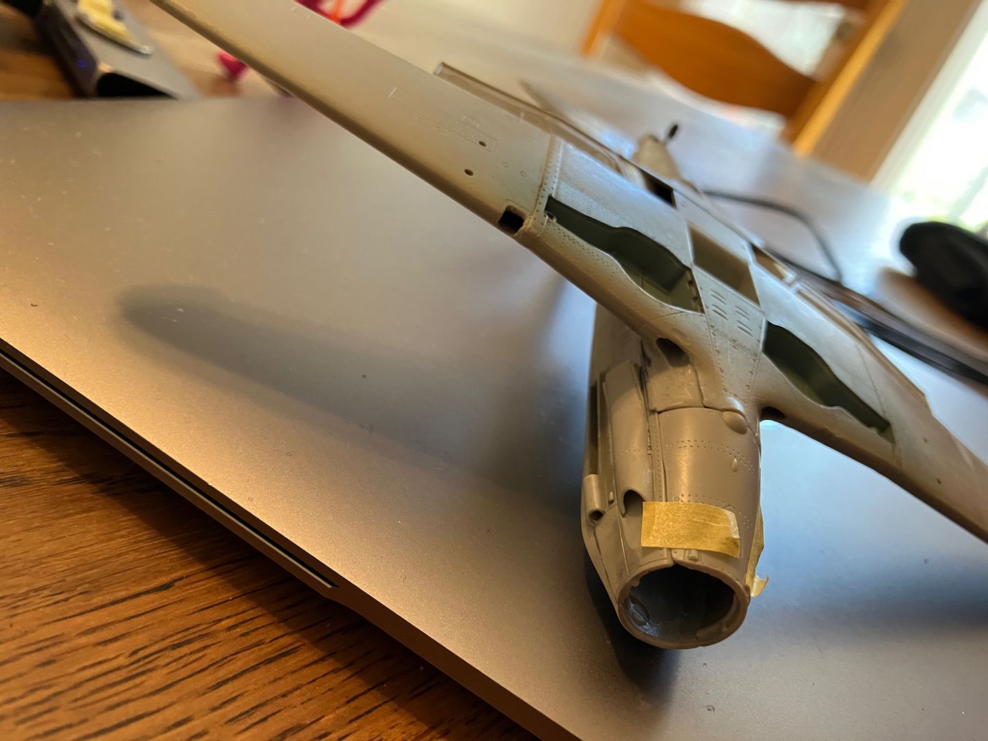 There are nine (9! 🙄) pieces that make up the forward fuselage and getting them all flying in formation together has been a struggle. I really like how the fuselage top is handled; a one-piece "cap" eliminates that pesky top seam there, but there my admiration ends. It was kinda like herding cats to get everything in place!