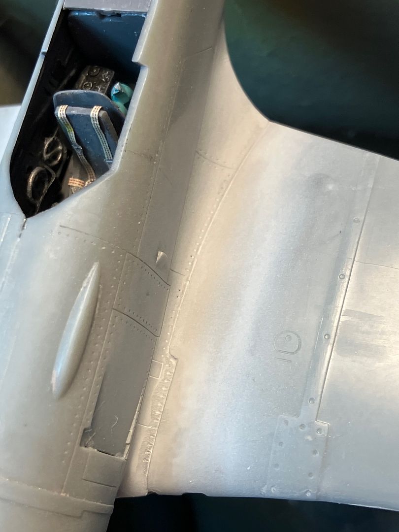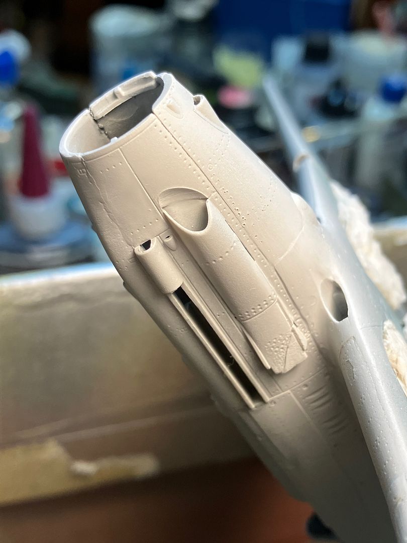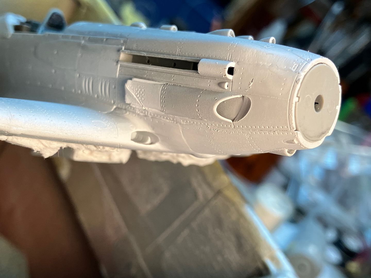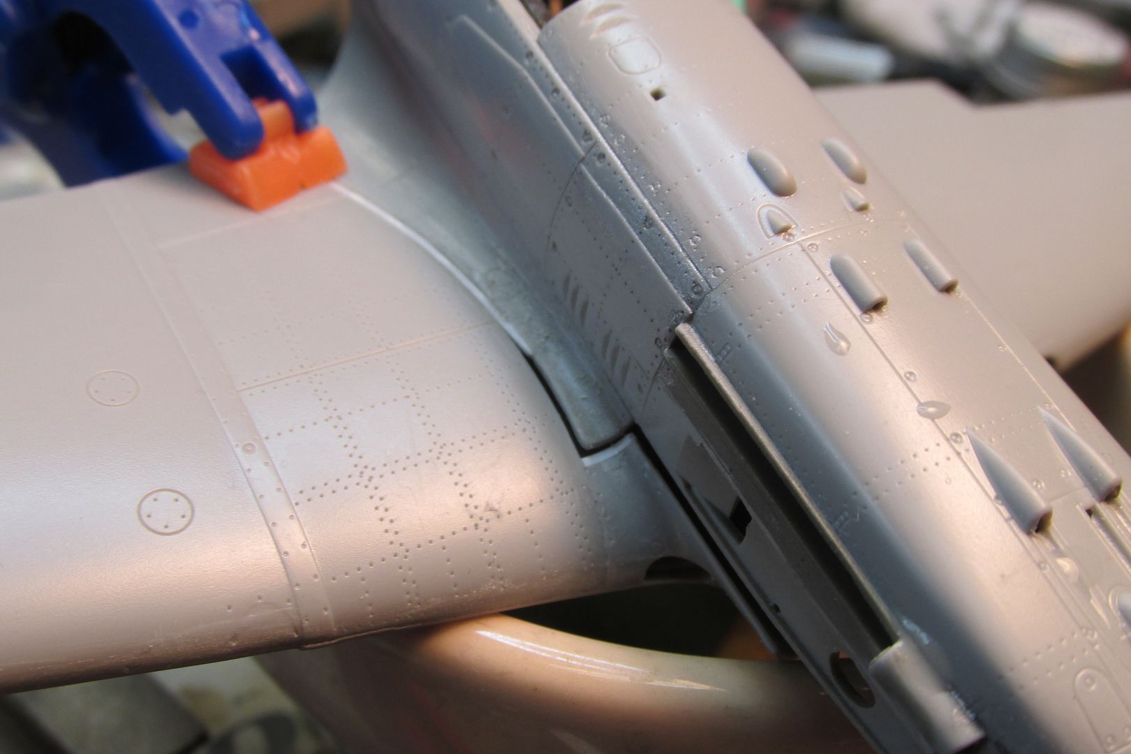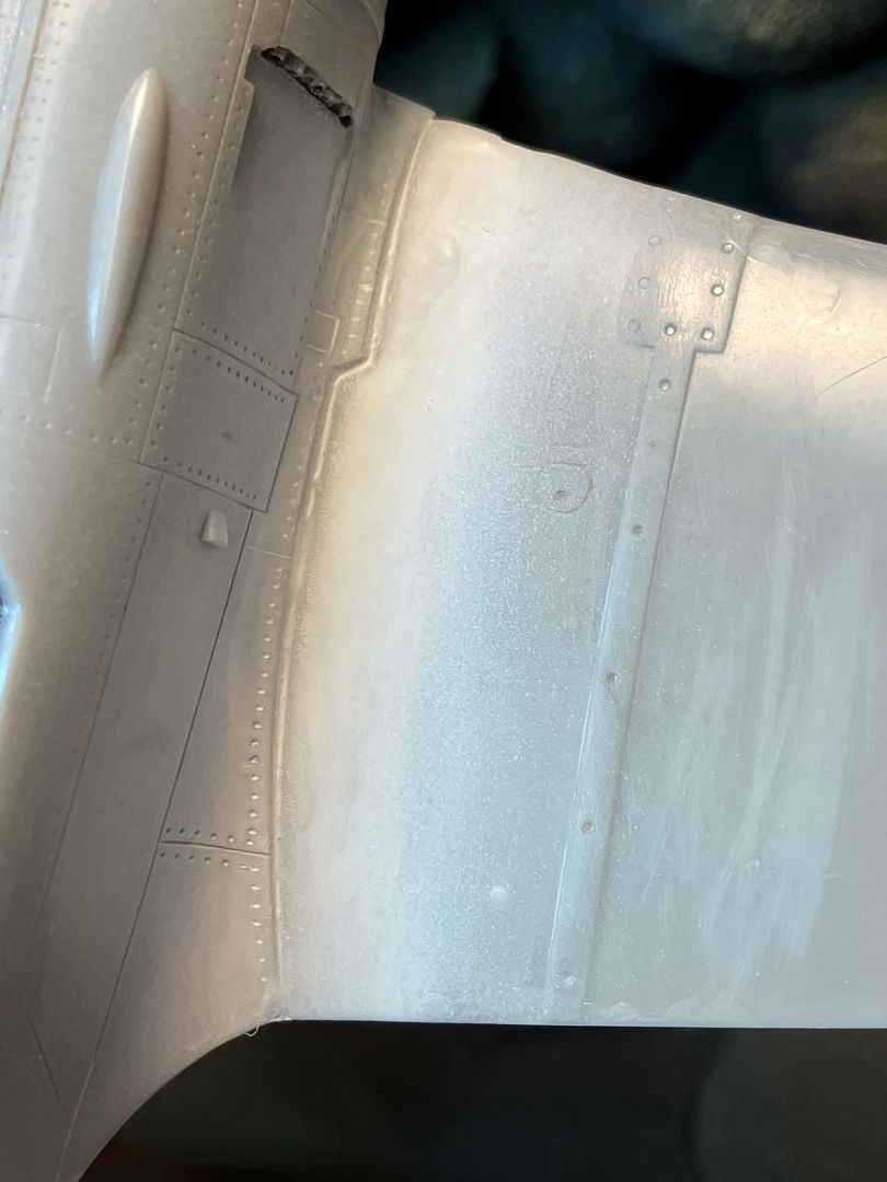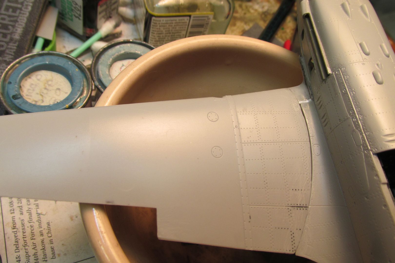 Thank you, Bruce! Bringing the heat really did help that problem. I've been futzing around with those nose joint issues for the last two cold days. I got up at 6am today after an early bedtime yesterday and got to work on the Mr. Surfacer 500 I had applied. I managed to get it fairly smooth and just had to try some white Vallejo primer over it. Well, it looks okay, not great. Some macro shots revealed some trouble areas still; more surfacer is drying in one place right now. I believe I could probably improve the appearance some but I'm running short on enthusiasm for that. I had tried to replace some rivet divots lost to sanding and that was good in one spot and terrible in another; I'll give that another try before more paint goes on.