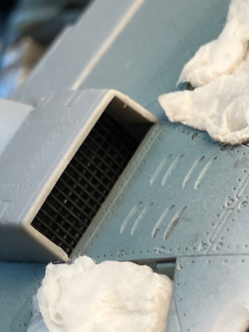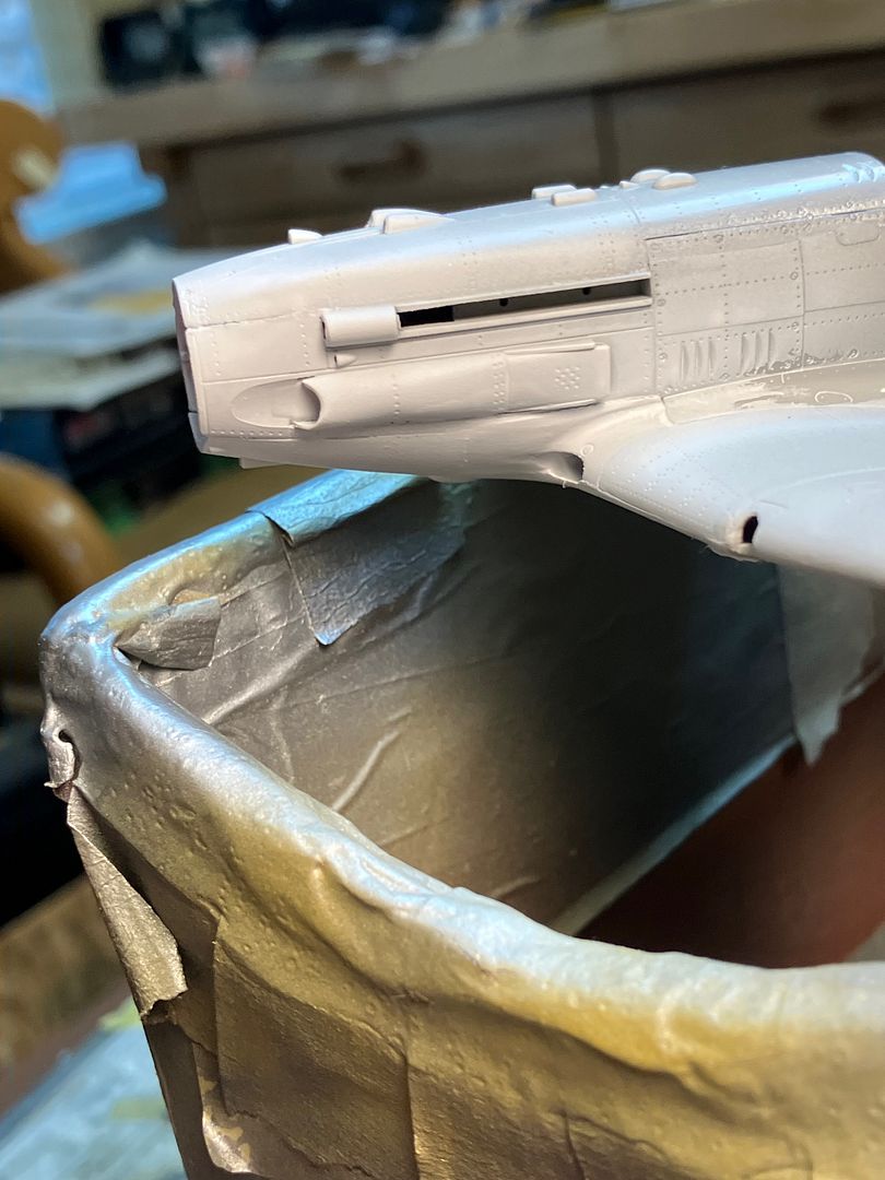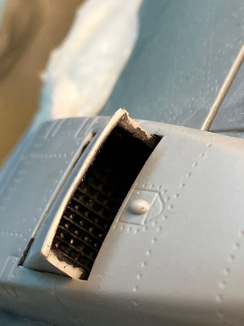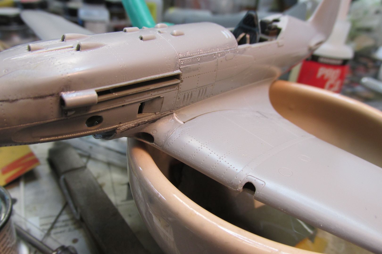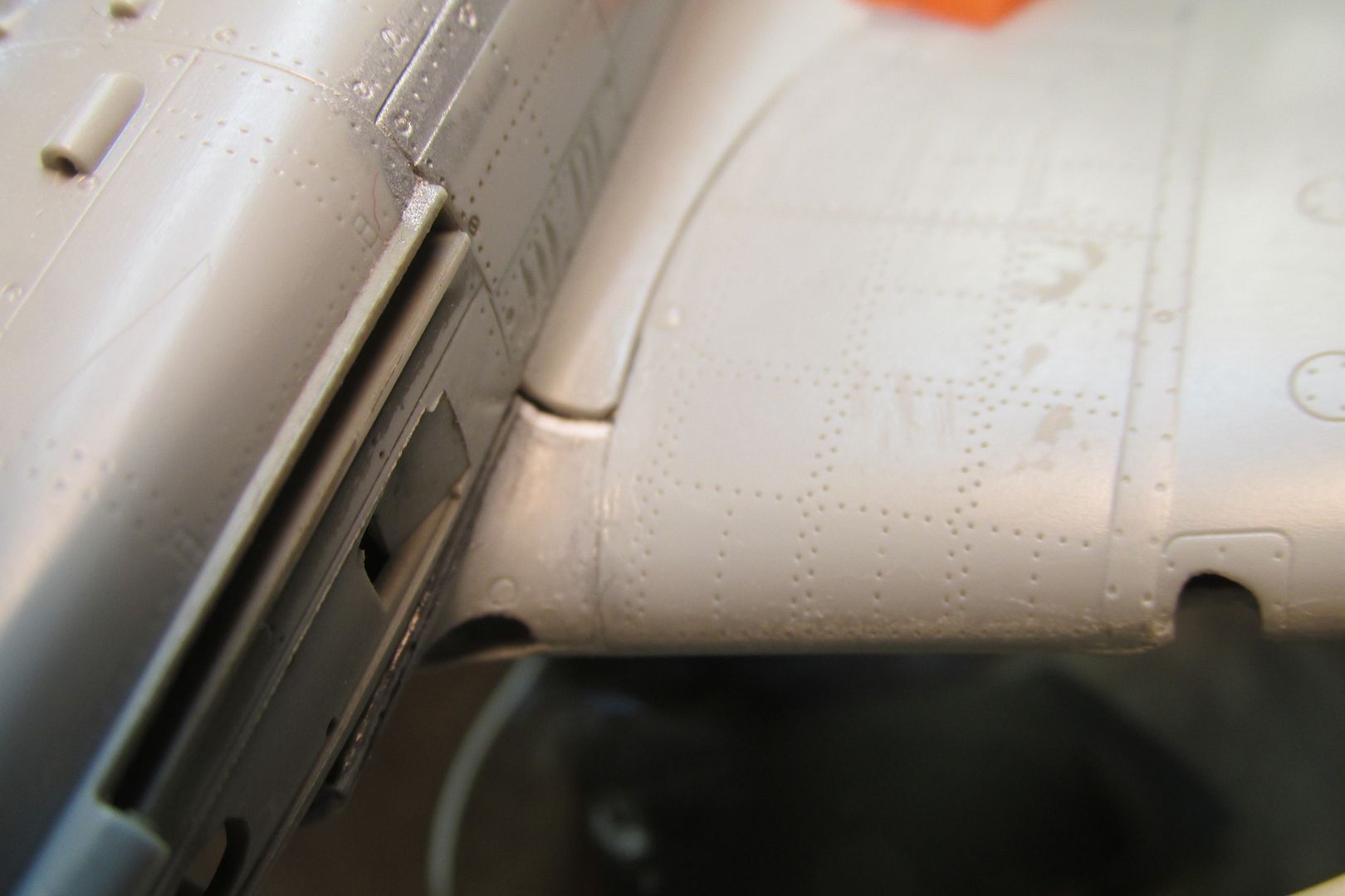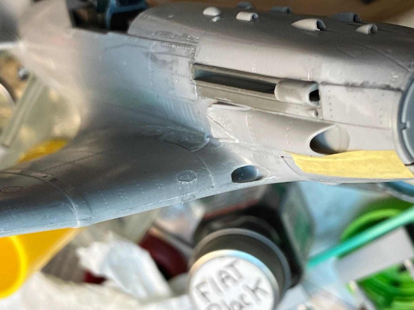 Thank you, Bruce! Bringing the heat really did help that problem. I've been futzing around with those nose joint issues for the last two cold days. I got up at 6am today after an early bedtime yesterday and got to work on the Mr. Surfacer 500 I had applied. I managed to get it fairly smooth and just had to try some white Vallejo primer over it. Well, it looks okay, not great. Some macro shots revealed some trouble areas still; more surfacer is drying in one place right now. I believe I could probably improve the appearance some but I'm running short on enthusiasm for that. I had tried to replace some rivet divots lost to sanding and that was good in one spot and terrible in another; I'll give that another try before more paint goes on.