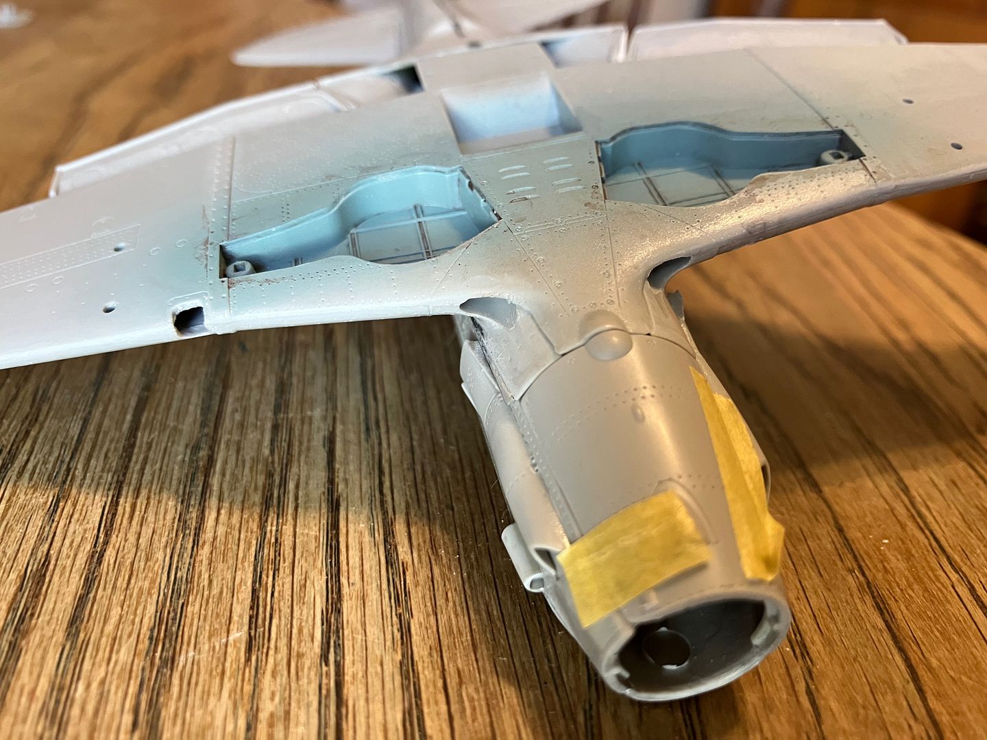 Here are a few pics to show the repair and overall status. I've ordered some Apoxie Sculpt to use on those wingroot areas and that should arrive early next week. Then, I hope to finish those and get them ready for more paint!