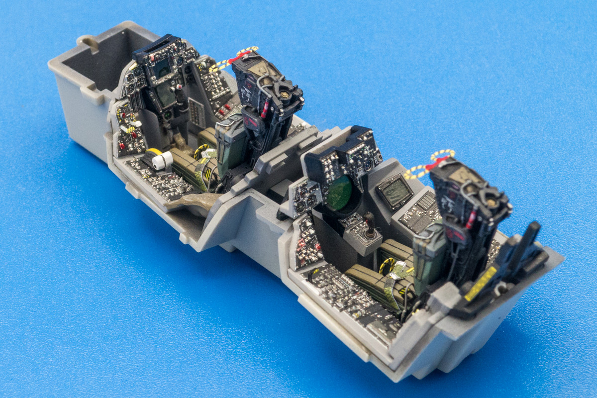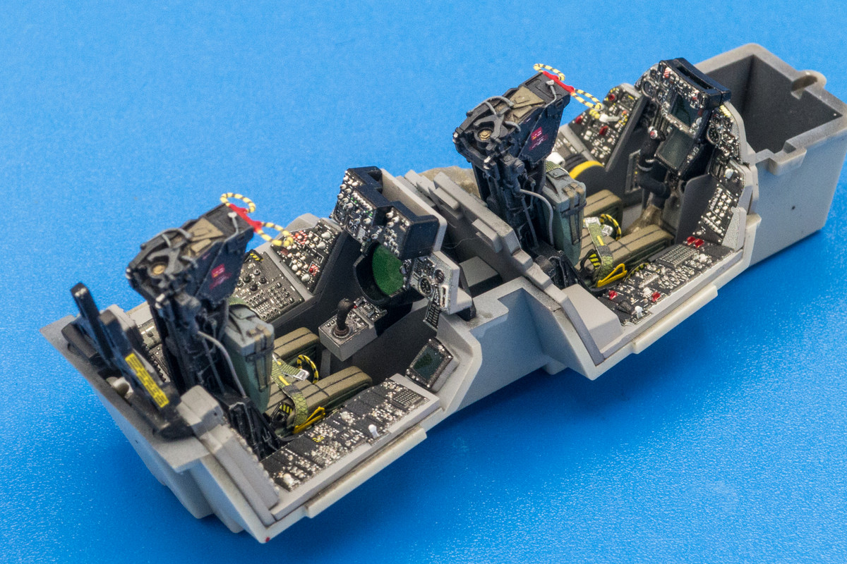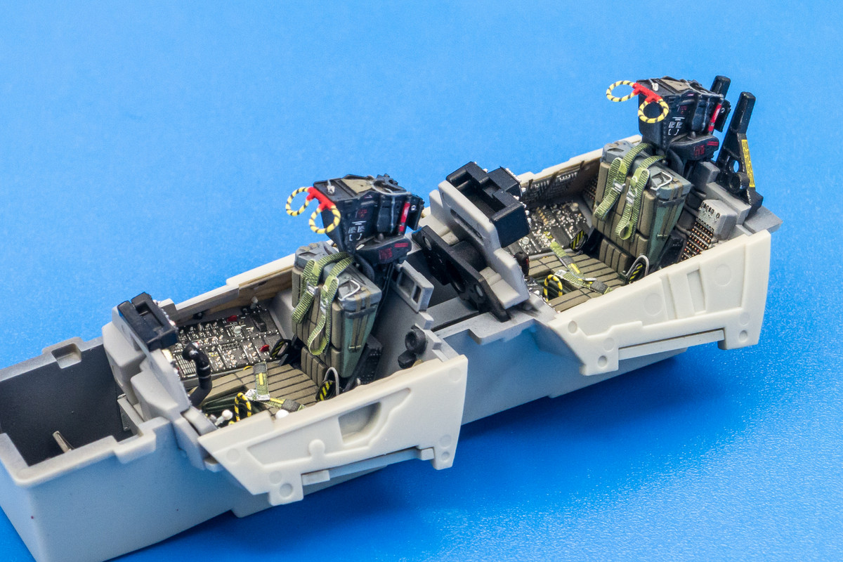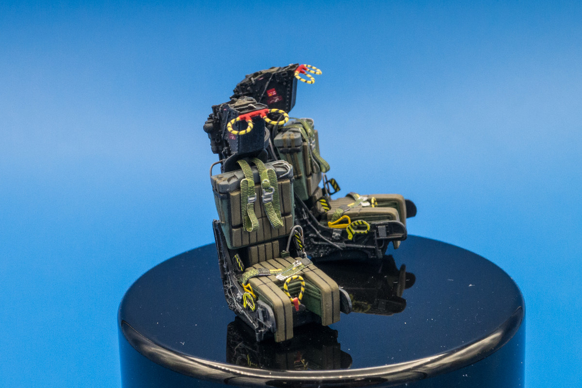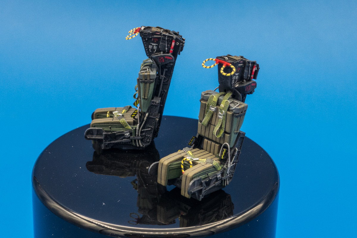 Still working on the bang seats for the Tomcat as the harnesses and other small bits need to be added. Here's a comparison between the yellow/black pull handles from the Quinta set and the Eduard photoetch. Not a clear winner in my book. The Quinta handles are nice in that they have the rounded profile on the top half (but flat on the bottom) AND the color is printed on both sides. However, I feel that the thickness is a bit overscale. The Eduard handles are finer but they are flat and are comprised of two halves to get the color on both sides of the piece.