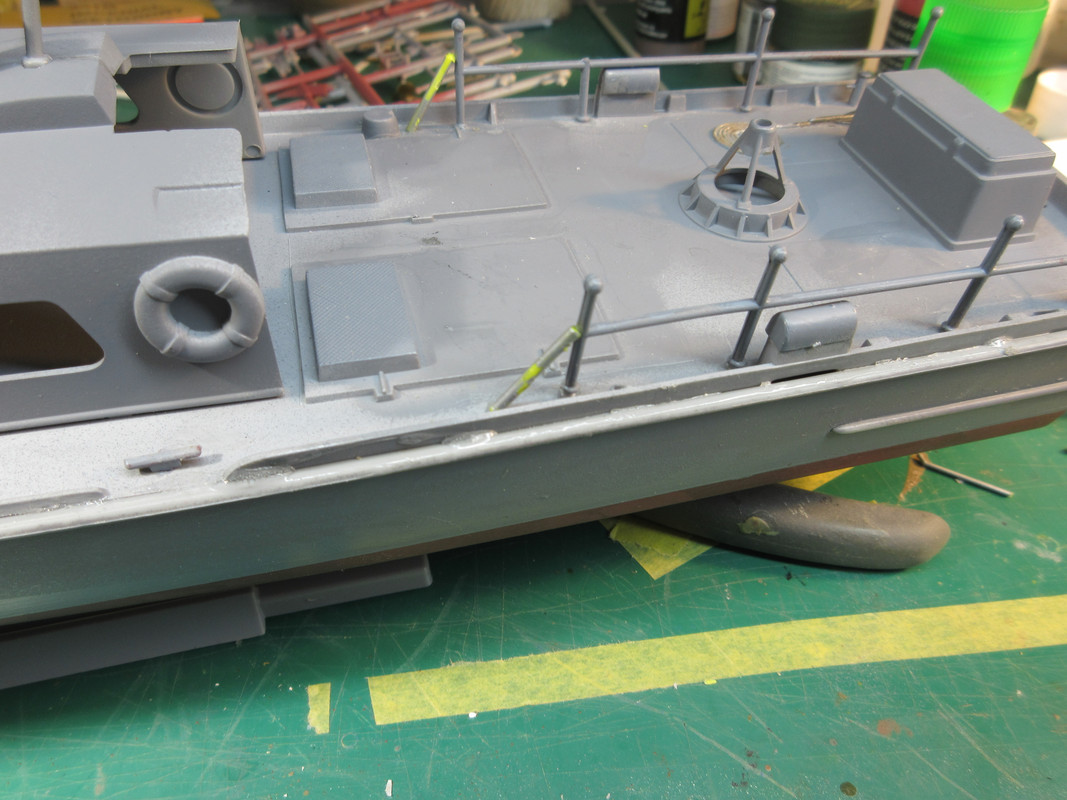 Odd thing, though. The railings did not fit properly. I actually did several dry fits. The holes for mounting were a tiny, tiny bit to small and the one forward with the angled piece was too far forward. So, I added a small piece of plastic.